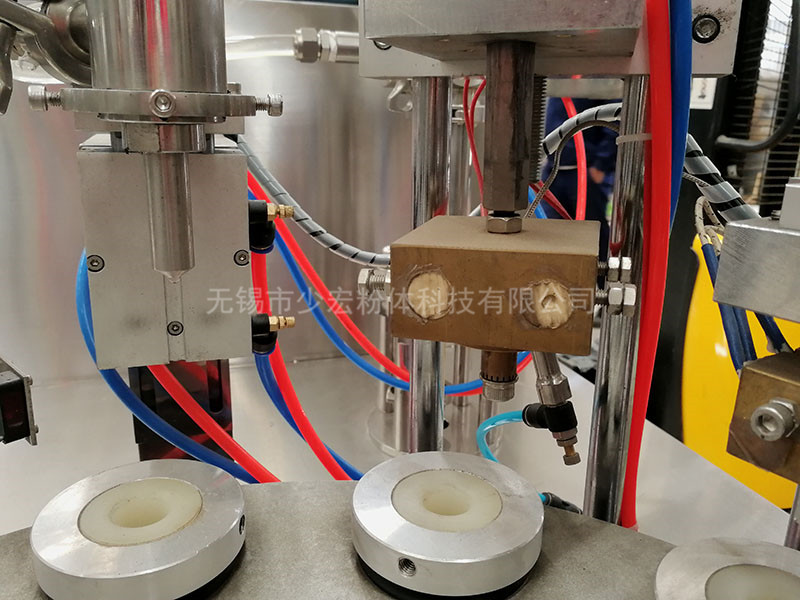 該機的灌裝、封口、壓齒、換位、定位等均采用機電、光電、氣泵一體化原理,通過凸輪分度機構,換位、定位,氣泵灌裝、封口等動作完成,灌裝、加熱、封口、切尾、頂桿等七個工作程序。所有動作均同一輸出同步完成。保證動作一體化,提高了動作的可靠性和穩定性。