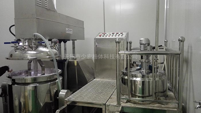 物料在水鍋、油鍋內通過加熱、攪拌進行混合反應后,由真空泵吸入乳化鍋,通過乳化鍋內上部的中心攪拌、聚四氟乙烯刮板始終迎合攪拌鍋形體,掃凈掛壁粘料,使被刮取的物料不斷產生新界面,再經過葉片的剪斷、壓縮、折疊,使其攪拌、混合而向下流往鍋體下方的均質器處,物料再通過高速旋轉的切割輪與固定的切割套之間所產生的強力的剪斷、沖擊、亂流等過程,物料在剪切縫中被切割,迅速破碎成200um-0.2um的微粒,由于乳化鍋內處于真空狀態,物料在攪拌過程中產生的氣泡被及時抽走。采用抽真空的方式,使所生產的制品在攪拌過程中不再混入氣泡,從而保證可制造出富有光澤、細膩及延展性良好的產品。